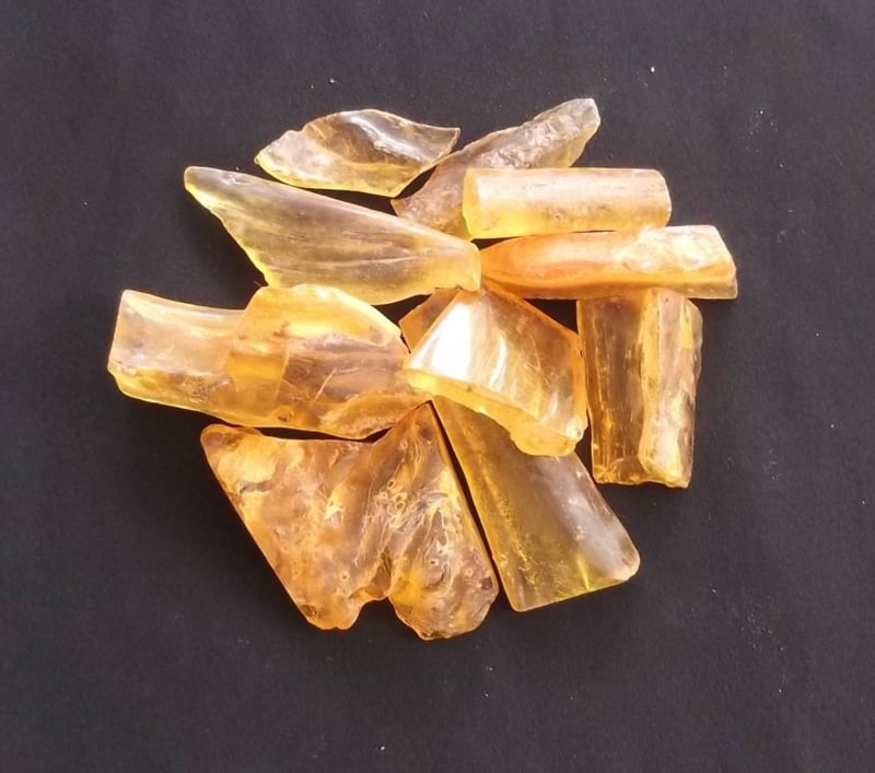 Barnsteen (copal ) tien stuks uit Madagaskar met div insluitingen samen met microscoop