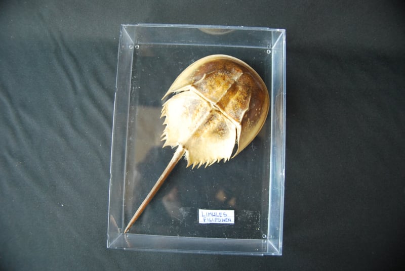 De limules zit in een hard plastik box zodat je ook de onderkant goed kan zien de losse deksel kan je makkelijk verwijderen even als de krab.