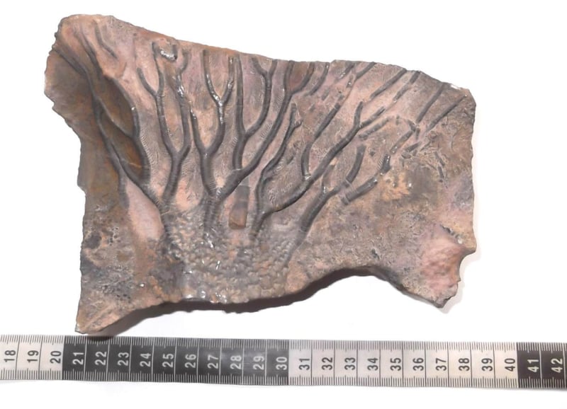Crinoid uit Noord-Afrika. Pentacrinus Het is een zwart/grijze crinoid op een prachtige rode achtergrond. De kroon van de Pentacrinus daarintegen was meestal zeer groot met vertakte armen het is een tegenhangervan de paleozoisch vorm Scyphocrinites wil je meer info raadpleeg mij dan, het zijn zeer verbluffende wezens en leefden tijdens het Boven-Siluur/Onder-Devoon