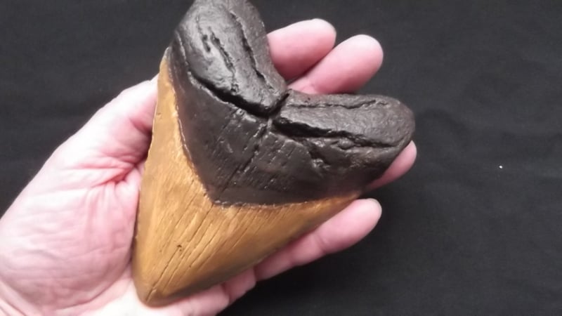 Carcharodon megalodon tand in 3 D gegoten replica in acrylhars geleverd met transparante standaard