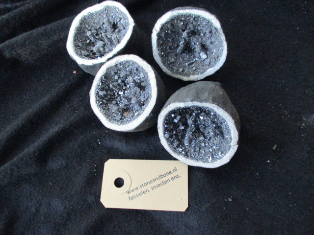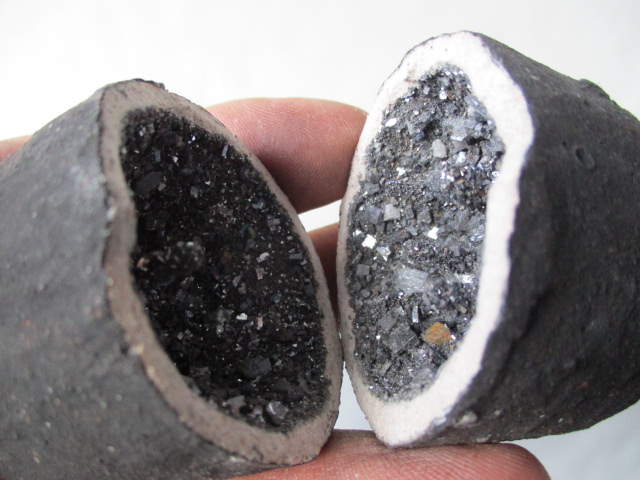 Galaniet bollen van teracotta aan de buitenkant zwart van binnen gevult met mooie galaniet kristallen die vast zitten aan de binnenkant zeer facinerend om te zien de bollen zijn setjes en passen op elkaar als een geheel. Het gewicht is 200 gram omtrek is 18 cm. de lengte van de samengestelde geodes is 9 cm. Herkomst Marokko, de maten en het gewicht kunnen iets afwijken maar niet veel.